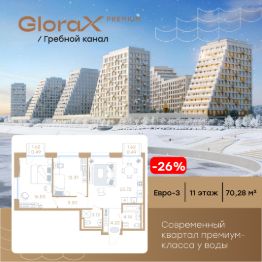 Продается 2-комн. квартира на 11-м этаже в строящемся проекте премиум-класса GloraX Premium Гребной канал. Общая площадь лота составляет 70,28 кв. м, из которых 28,90 кв. м отведено под жилую и 25,72 кв. м под кухонную зону. Номер квартиры - 107.