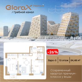 Продается 2-комн. квартира на 13-м этаже в строящемся проекте премиум-класса GloraX Premium Гребной канал. Общая площадь лота составляет 54,48 кв. м, из которых 26,44 кв. м отведено под жилую и 17,65 кв. м под кухонную зону. Номер квартиры - 127.