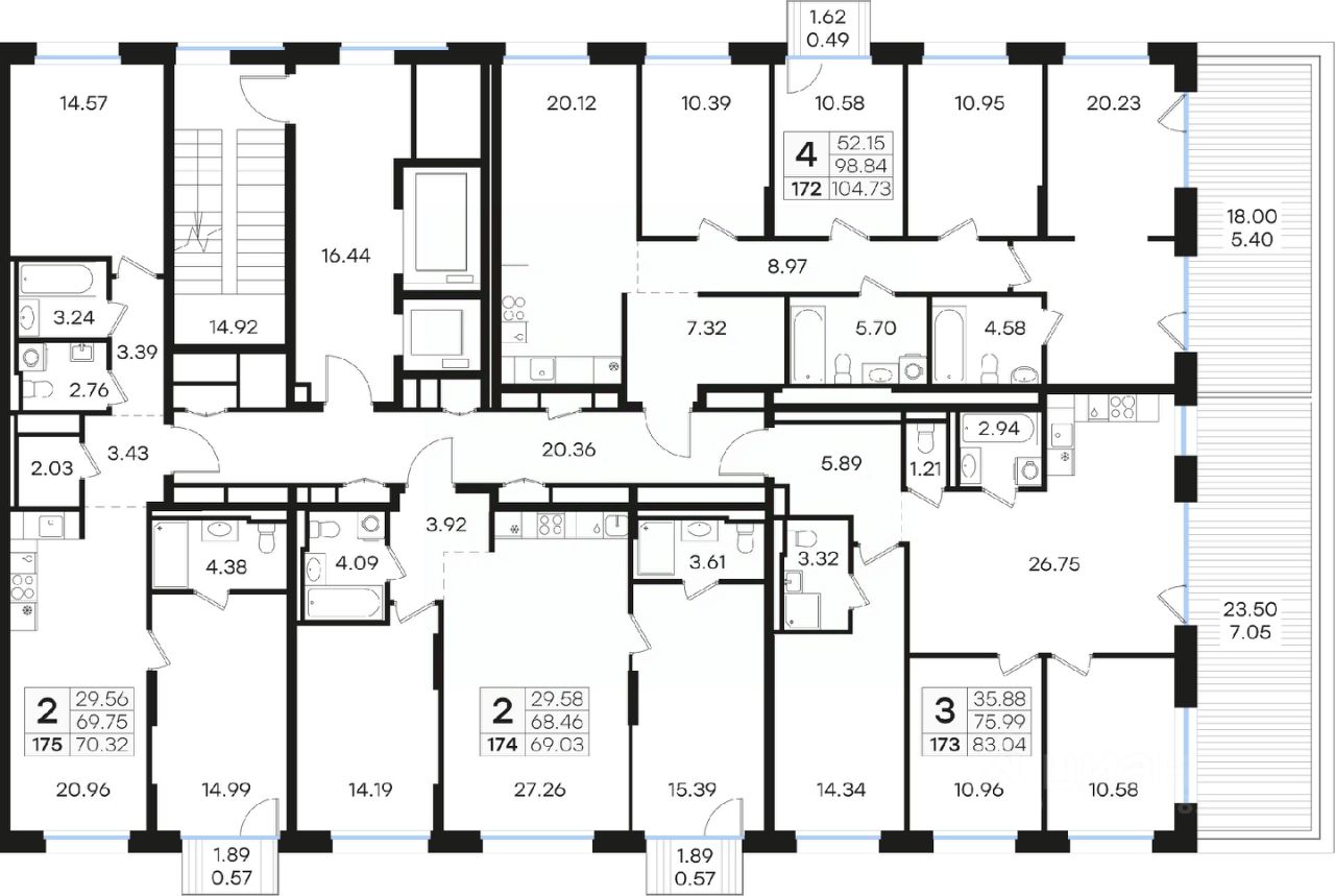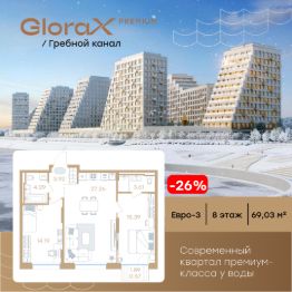Продается 2-комн. квартира на 8-м этаже в строящемся проекте премиум-класса GloraX Premium Гребной канал. Общая площадь лота составляет 69,03 кв. м, из которых 29,58 кв. м отведено под жилую и 27,26 кв. м под кухонную зону. Номер квартиры - 174.