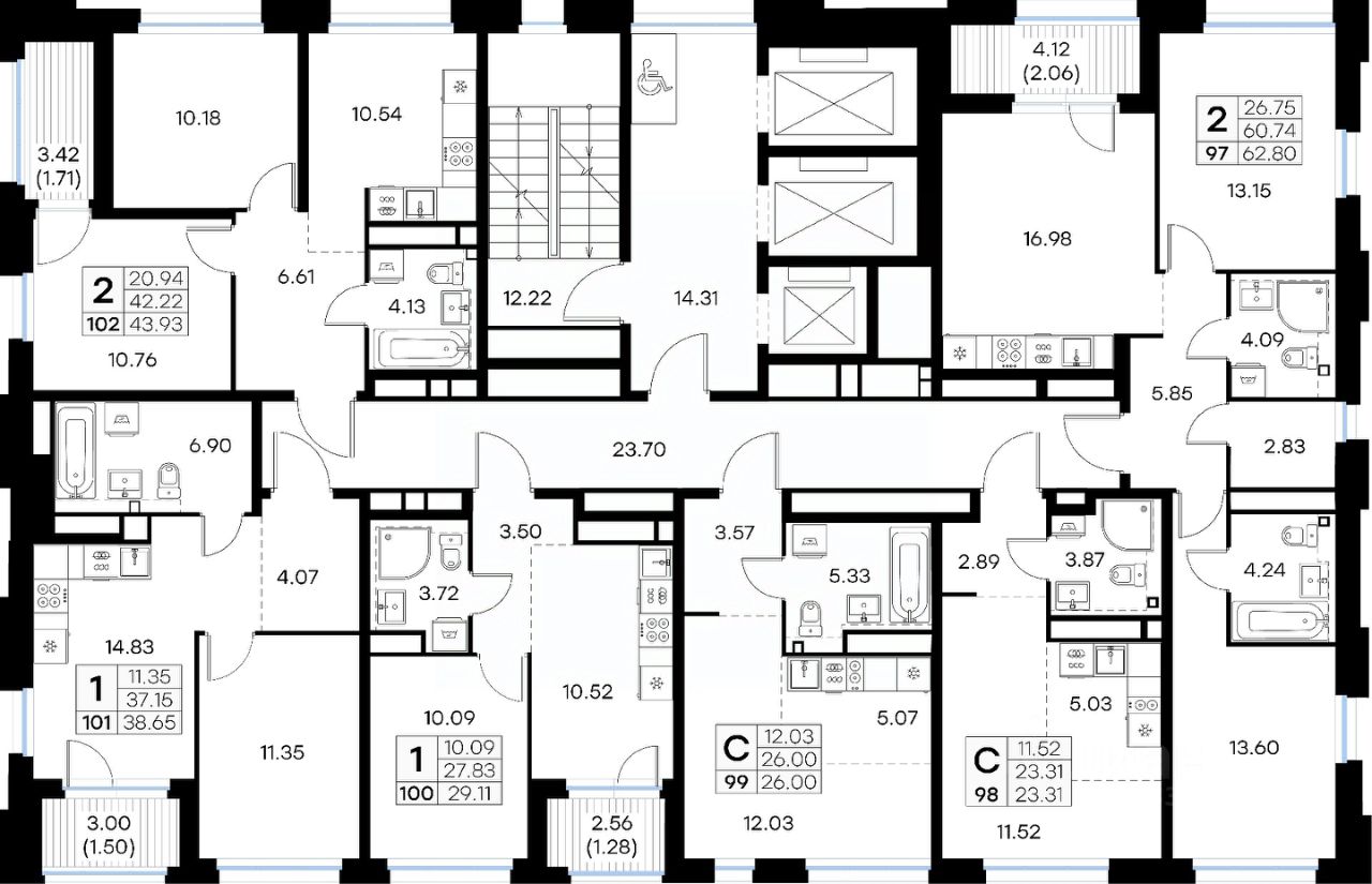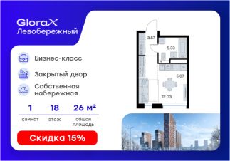 Продается квартира-студия на 18-м этаже в строящемся проекте бизнес-класса GloraX Левобережный. Общая площадь лота составляет 26,00 кв. м, из которых 12,03 кв. м отведено под жилую и кв. м под кухонную зону. Номер квартиры - 99.