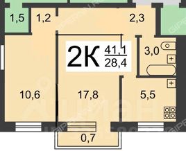 Площади: Общая — 40.4 м², жилая — 28.4 м², кухня — 5,5 м².