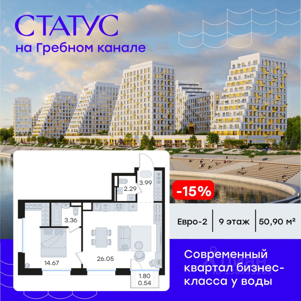 Продается 1-комн. квартира на 9-м этаже в строящемся проекте бизнес-класса СТАТУС на Гребном канале. Общая площадь лота составляет 50,90 кв. м, из которых 14,67 кв. м отведено под жилую и 26,05 кв. м под кухонную зону. Номер квартиры - 341.