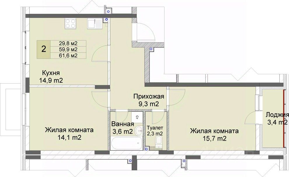 Продается 2-комн. квартира с отделкой в ЖК "Кузнечиха город" на 1 этаже. Общая площадь: 61.6 кв.м., жилая: 29.8 кв.м., площадь просторной кухни-столовой: 14.9 кв.м. Квартира - распашонка, без проходных комнат, окна выходят на paзные стороны дома. В квартире одна лоджия, один раздельный санузел. Высота потолков 2.5 м.