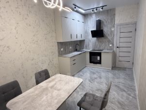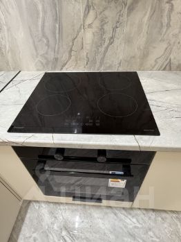 В кухне декоративная штукатурка, на полу широкоформатный керамогранит, Установлен новый современный кухонный гарнитур с техникой: духовой шкаф, вытяжка, индукционная варочная панель, посудомоечная машина, раздвижной кухонный стол, стулья велюр.