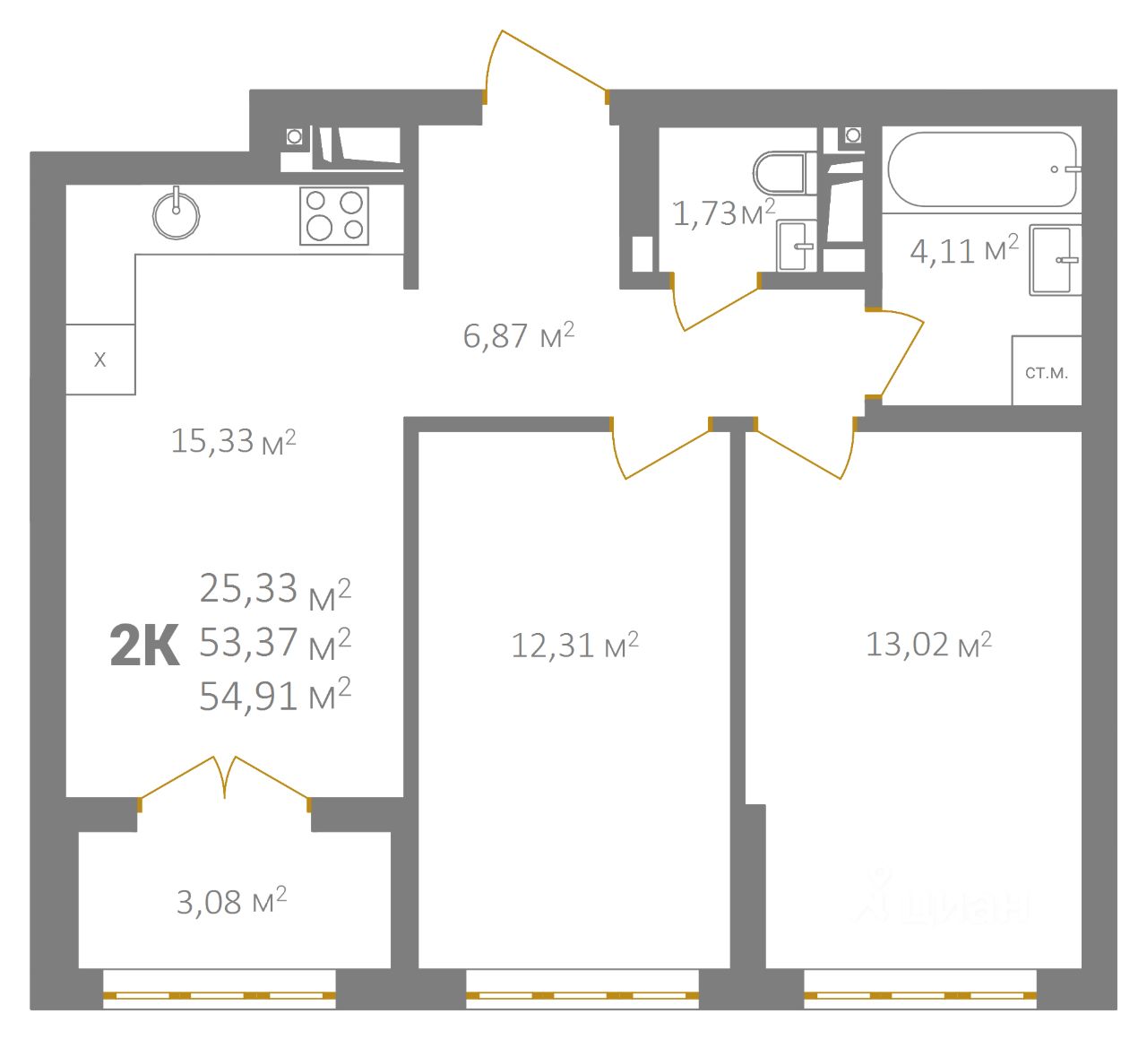 Общая площадь54,91 м²