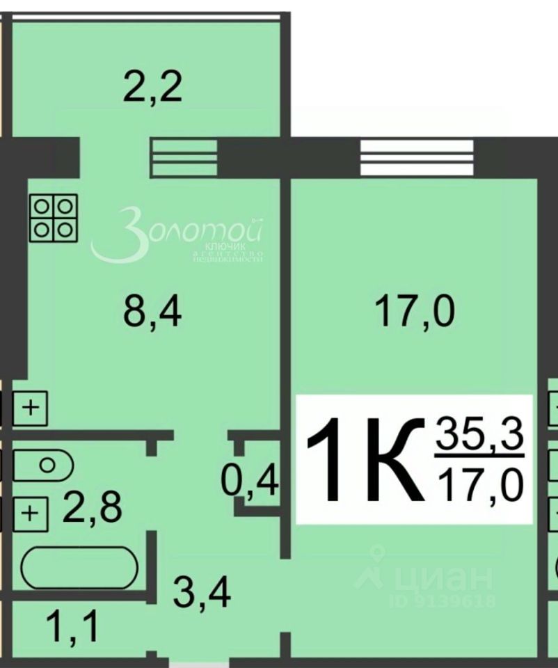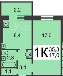 - Общая площадь 33,4 кв.м