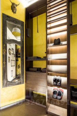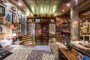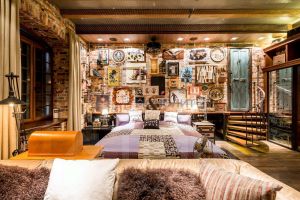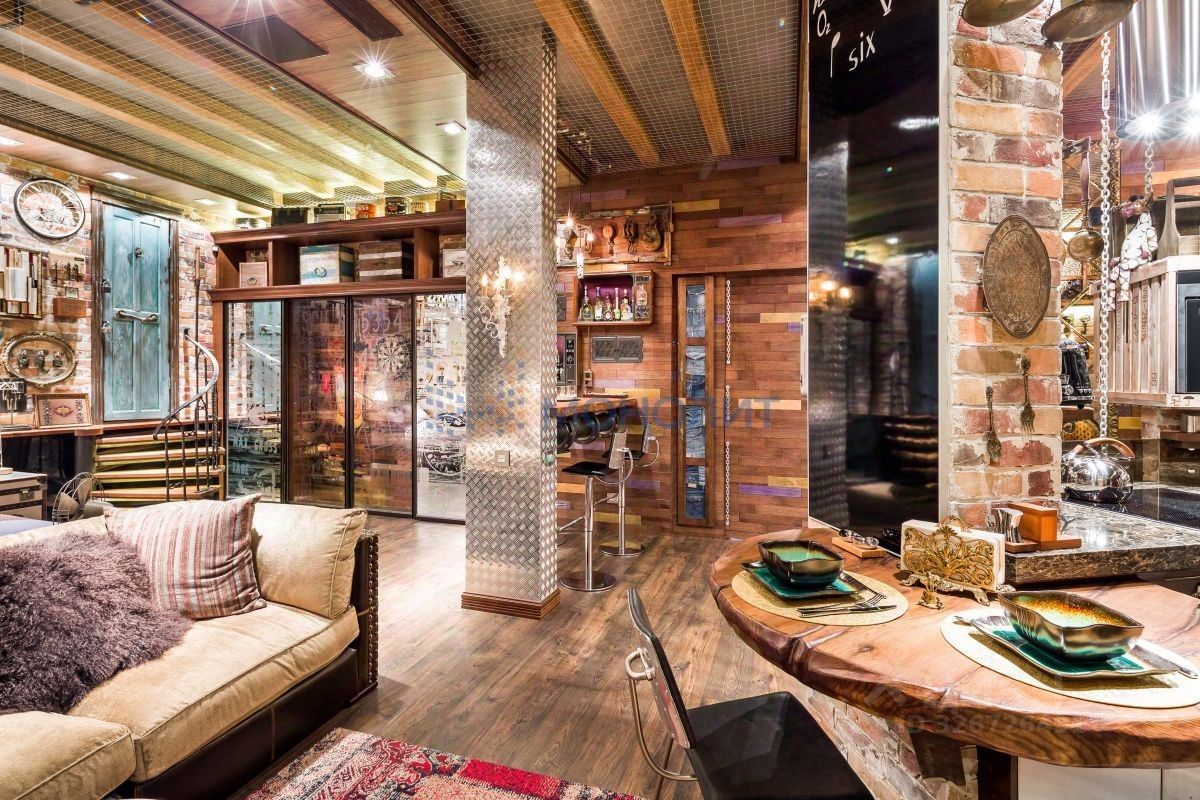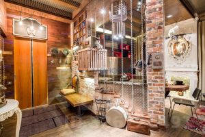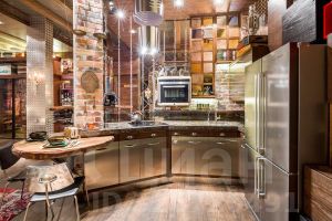 Сразу замечаешь, что из четырех стен, образующих первое жилое пространство, две выложены старинной кирпичной кладкой, и две стены обложены деревянными и металлическими индивидуальными панелями, скрывающими двери в другие помещения и секретные дверцы разнообразных систем хранения и кухонных модулей. Внутренняя входная дверь (выполняющая роль не только дизайнерской находки, но и дополнительного блока шумопонижения) выглядит как сомкнутые створки советского лифта. Брутальная барная столешница из массива дуба укреплена на основательной трубе с кольцевыми фланцами. Сверху здесь и в некоторых других местах видны металлические трубки с фитингами, являющиеся частью индивидуальных светильников и элементов функционального декора. Элементы из металла не могут не привлекать внимания: натянутые по вертикали цепи в качестве зонирующего элемента, ручки на скользящих панелях дверей из фрагментов таких же цепей; цилиндрическая вытяжка-"трансформер" на пульте управления, выглядящая одновременно и как "мобиль", и как предмет кинематографической космической станции; торшер и прикроватные дизайнерские лампы; шляпки гвоздей кожаной обивки дивана. Спинки барных табуретов, дверцы холодильника, рифленая поверхность алюминиевого листа, полностью "драпирующего" вертикальную коммунальную стойку, металлическая сетка на потолке и даже фасадные элементы кухни весь этот "промдизайн" воспринимается как "черта характера" данного помещения.