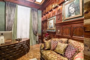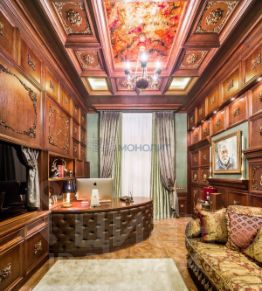 Но ощущается и другая "линия" в деталях интерьера, выполненных в дереве. Пол, балочные элементы потолка, стены, рамы окон, подоконники, жалюзийные створки, ламели и панели в отделке поверхностей, резные обрамления зеркал дерево повсюду в этой квартире.
