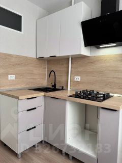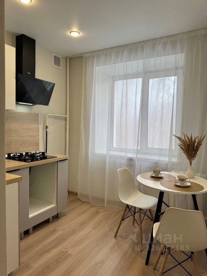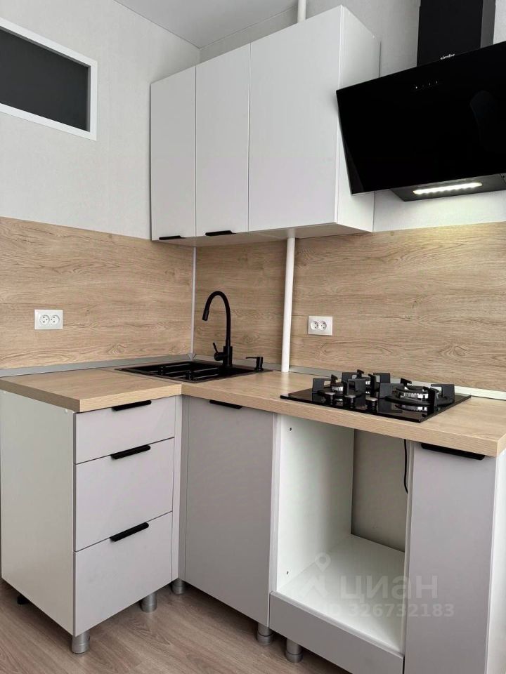 Установлен современный кухонный гарнитур с газовой варочной панелью, вытяжкой, раковиной и смесителем.При желании возможно установить встроенный духовой шкаф или закрыть тумбу фасадом. В планировке гарнитура предусмотрена возможность установки холодильника и стиральной машины. Имеется новая столовая группа стол, 2 стула. Текстиль на окне - тюль.