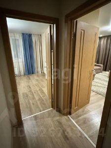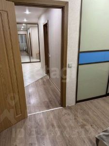 В квартире выполнен качественный ремонт с натяжными потолками и практичным напольным покрытием (плитка, ламинат). Для хранения вещей предусмотрены два вместительных шкафа-купе в коридоре и спальне, а также шкаф на балконе.