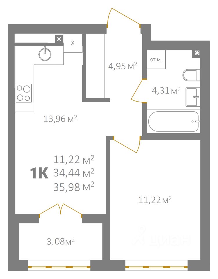 Общая площадь35,98 м²