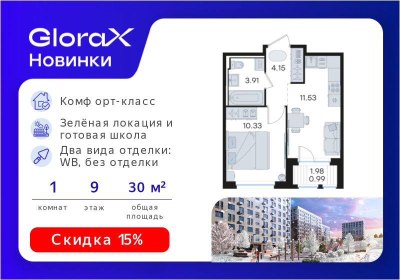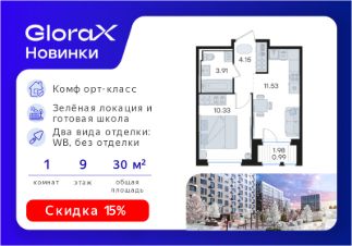 Продается 1-комн. квартира на 9-м этаже в строящемся проекте комфорт-класса GloraX Новинки. Общая площадь лота составляет 30,91 кв. м, из которых 10,33 кв. м отведено под жилую и 11,53 кв. м под кухонную зону. Номер квартиры - 485.
