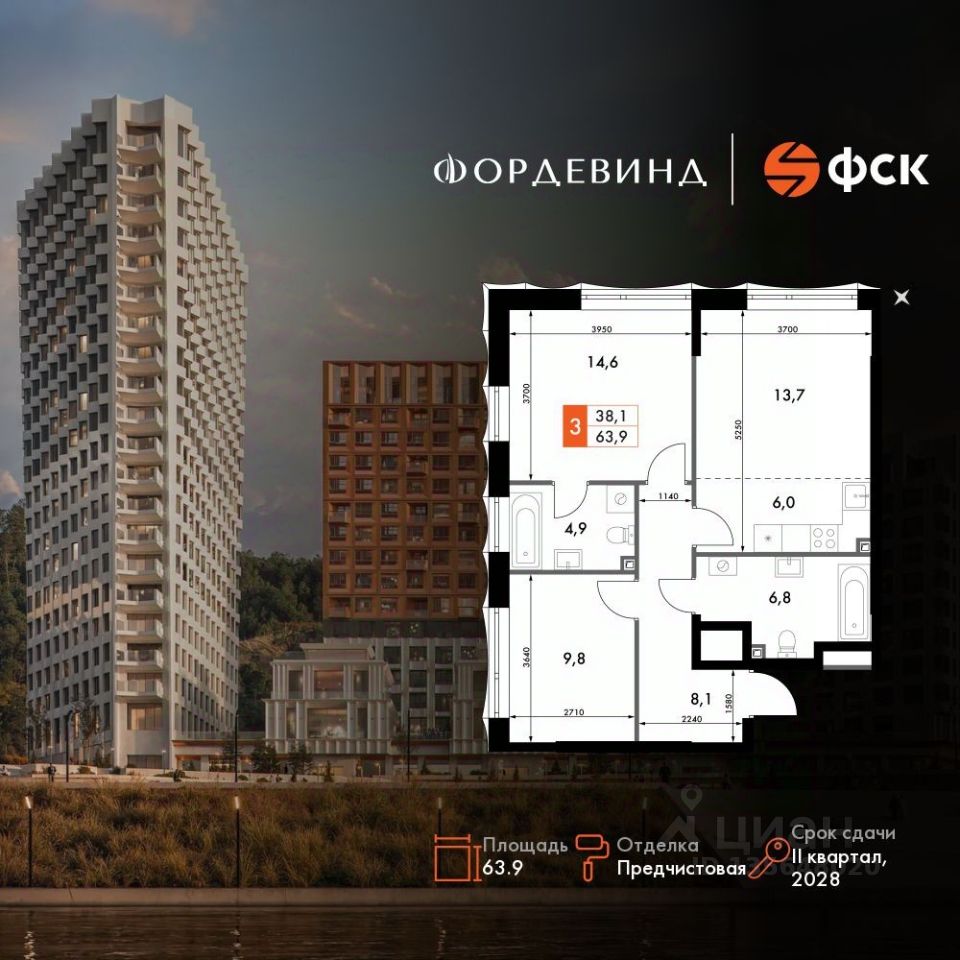 Продаётся 3-к квартира номер 357 общей площадью 63.9 кв.м. на 7-м этаже 10 этажного здания. Предчистовая отделка. Цена с учётом скидки.