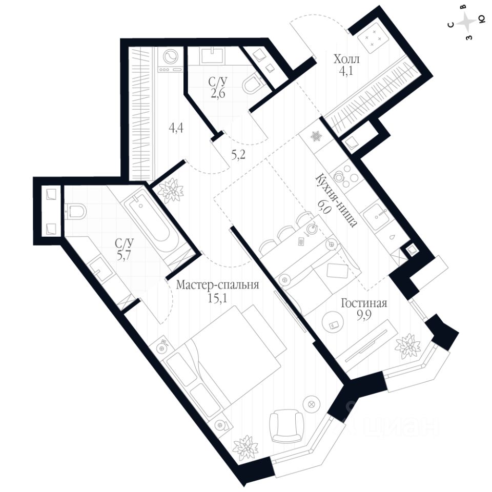 Комплекс объединяет шесть корпусов переменной этажности - от 3 до 20 этажей, что позволяет выбрать формат жилья по своему ритму жизни. В проекте представлены квартиры площадью от 27 до 237,9 м², включая эксклюзивные пентхаусы и урбан-виллы с собственными террасами и панорамными окнами.