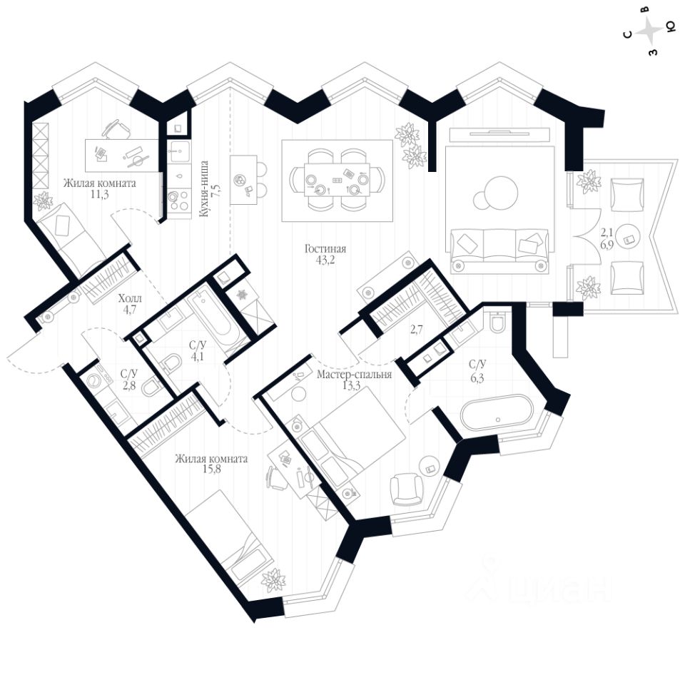 - Мастер-зона с санузлом. Уют и комфорт в одном пространстве.