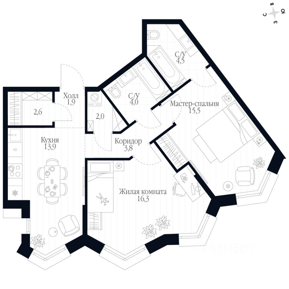 - Мастер-зона с санузлом. Уют и комфорт в одном пространстве.