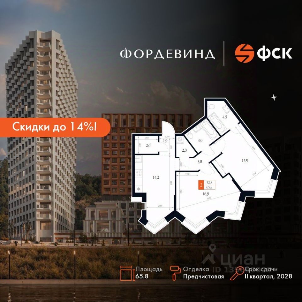 Продаётся 2-к квартира номер 145 общей площадью 65.8 кв.м. на 17-м этаже 20 этажного здания. Предчистовая отделка. Цена с учётом скидки.