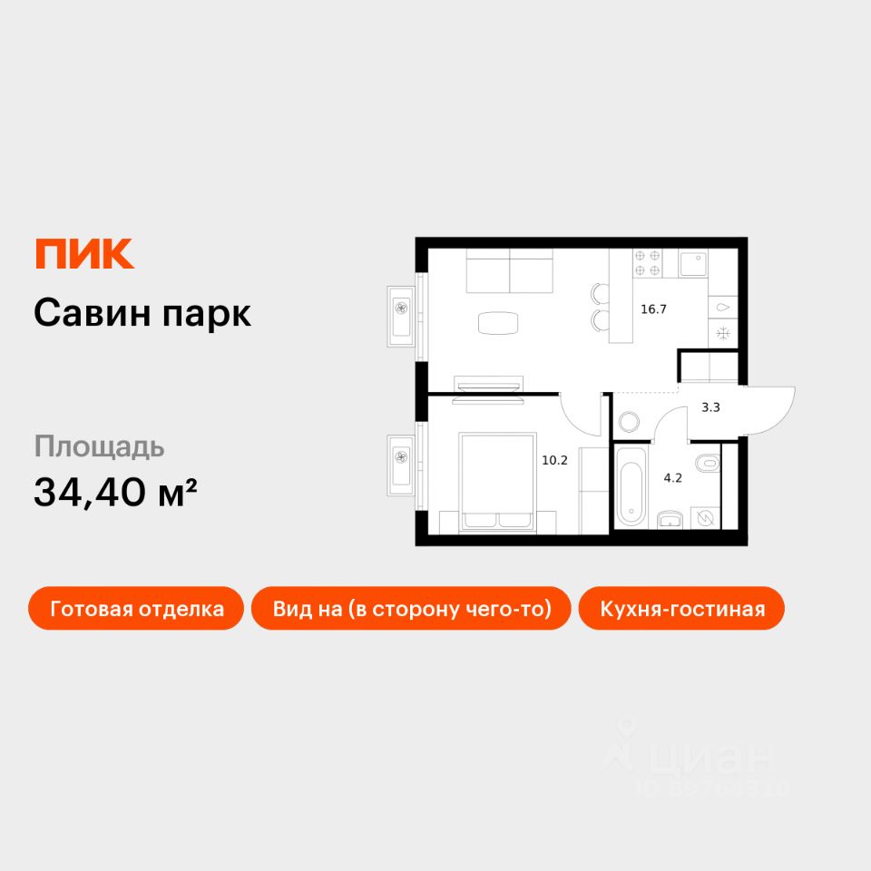 Продаётся 1-комн. квартира площадью 34,4 кв.м на 4 этаже 17 этажного дома (Корпус 7, Секция 1) проекта ПИК Савин парк. Светлый просторный подъезд на уровне земли, функциональная планировка, большие окна, c отделкой.