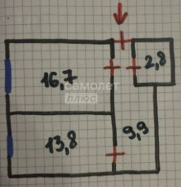 Планировка: Две изолированные комнаты (16,7 и 13,8 кв.м.), просторная кухня-гостиная 9,9 кв.м., совмещенный санузел.