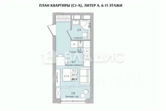 Общая площадь: 20,9 кв. м, из которых 11,5 кв. м — кухня-гостиная. Есть лоджия-зимний сад
