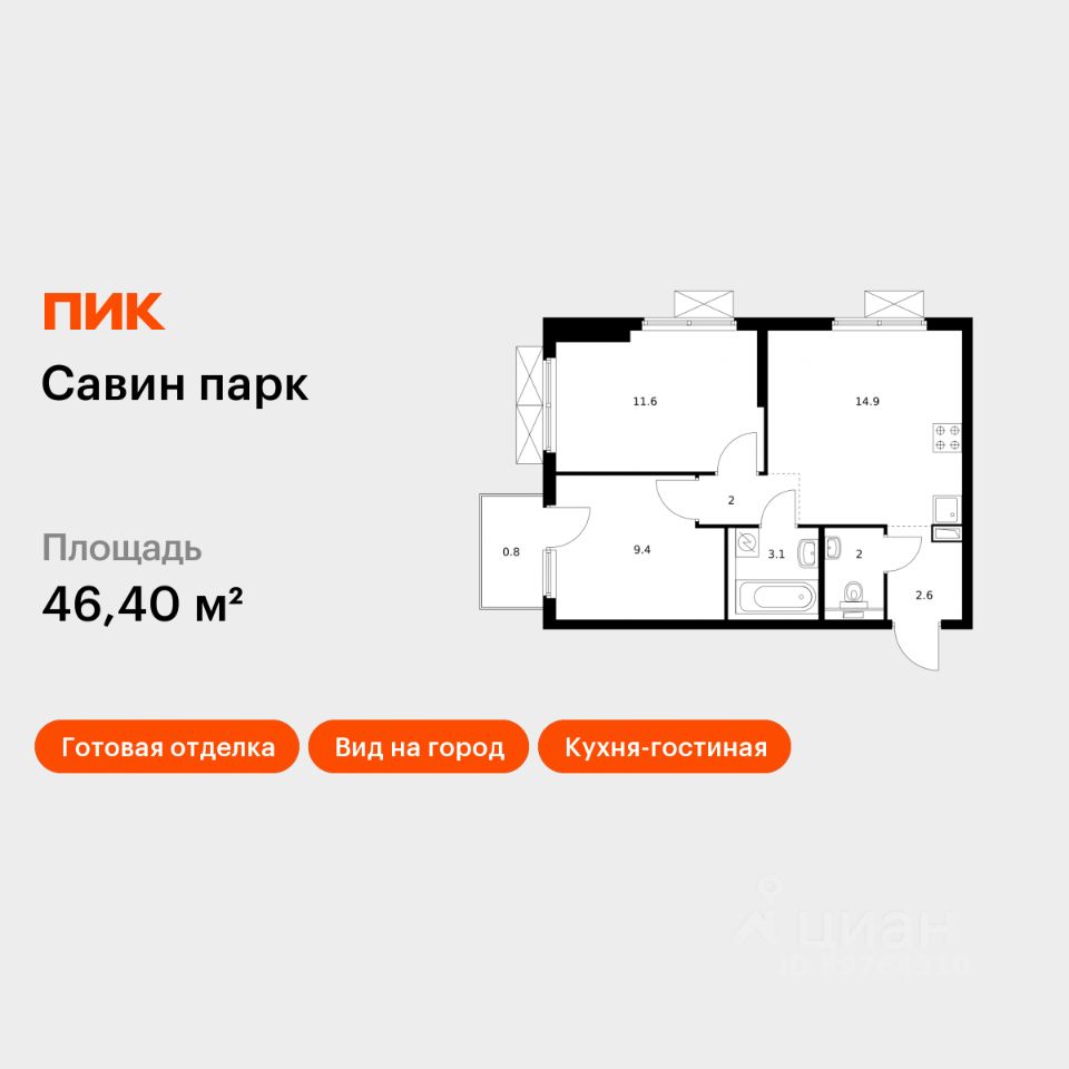 Продаётся 2-комн. квартира площадью 46,4 кв.м на 19 этаже 25 этажного дома (Корпус 3, Секция 1) проекта ПИК Савин парк. Светлый просторный подъезд на уровне земли, функциональная планировка, большие окна, c отделкой.