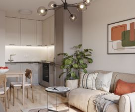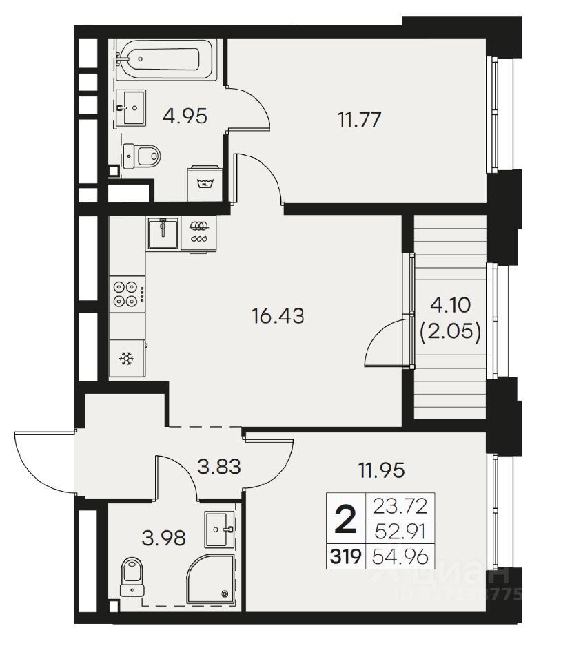 Особенно ценно, что кухнягостиная 16,43 м² легко зонируется на кухню и гостиную, а две отдельные комнаты удобно использовать как спальню и детскую/кабинет. Два санузла — редкое преимущество в этом метраже: один можно сделать гостевым, второй — полноценной ваннойзоной с хранением. Лоджия добавляет полезное пространство под лаунжзону, рабочее место или сезонное хранение.