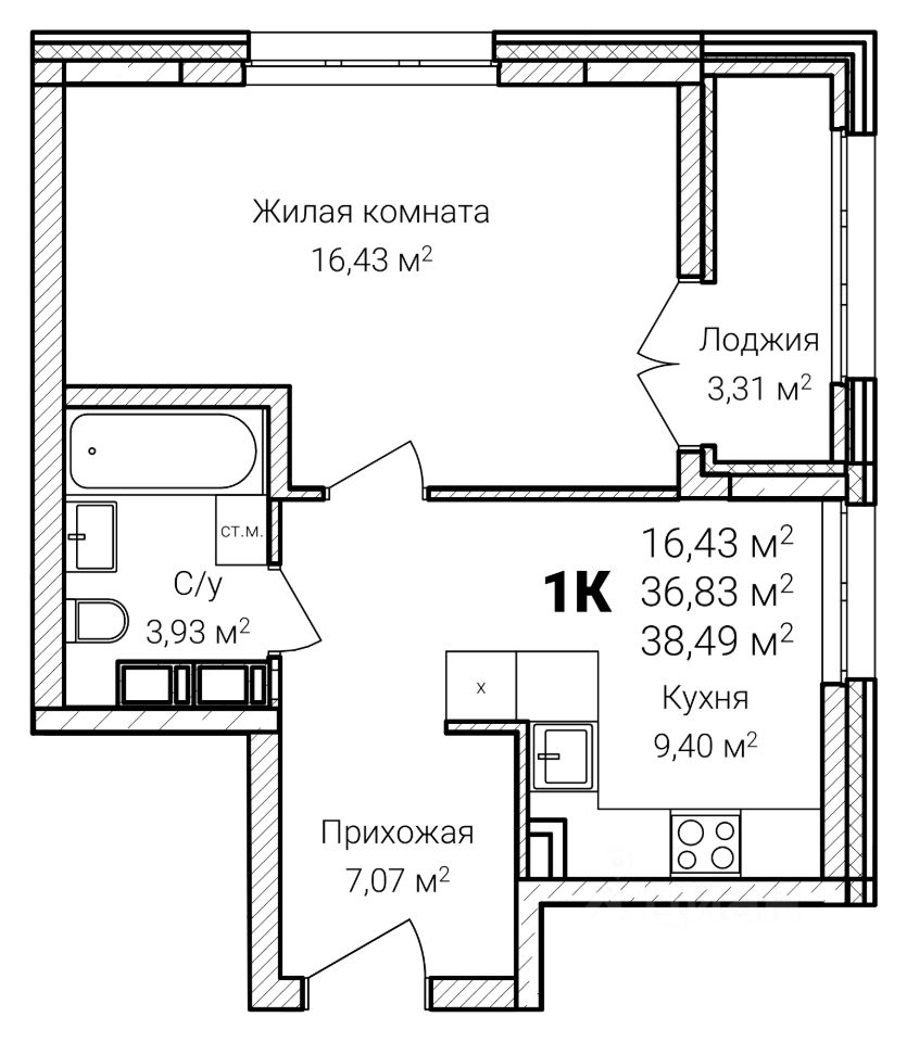 Общая площадь38,49 м²