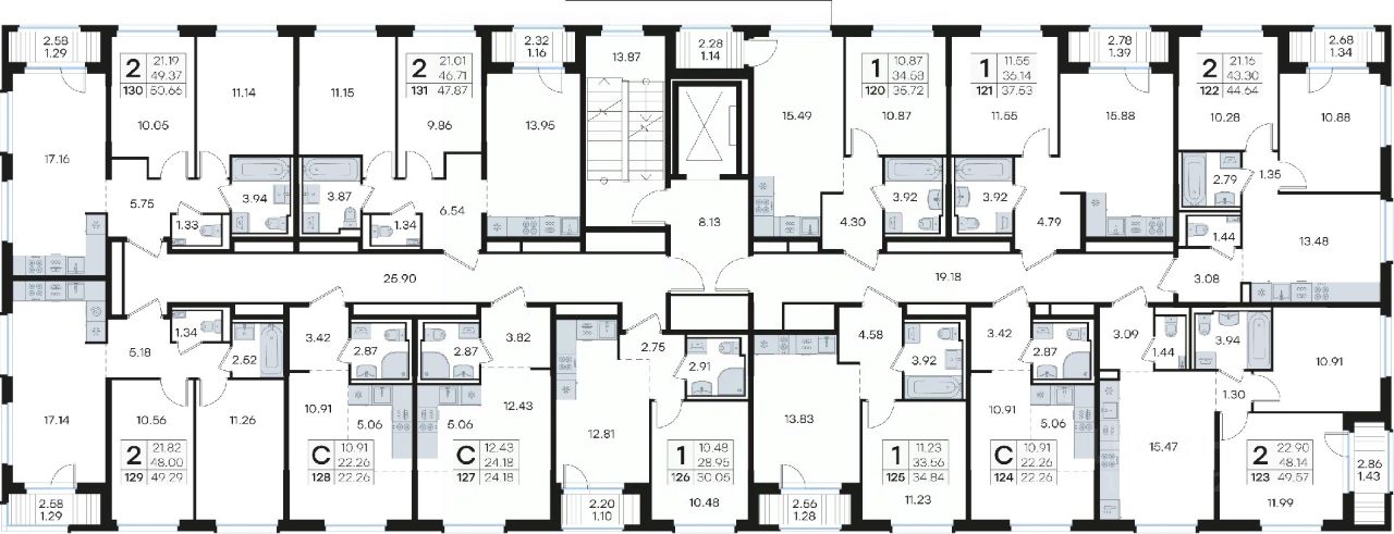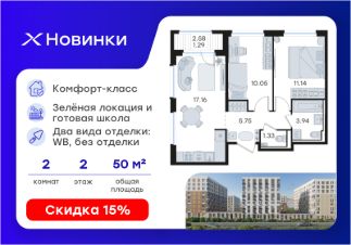 Продается 2-комн. квартира на 2-м этаже в строящемся проекте комфорт-класса Новинки. Общая площадь лота составляет 50,66 кв. м, из которых 21,19 кв. м отведено под жилую и 17,16 кв. м под кухонную зону. Номер квартиры - 130.
