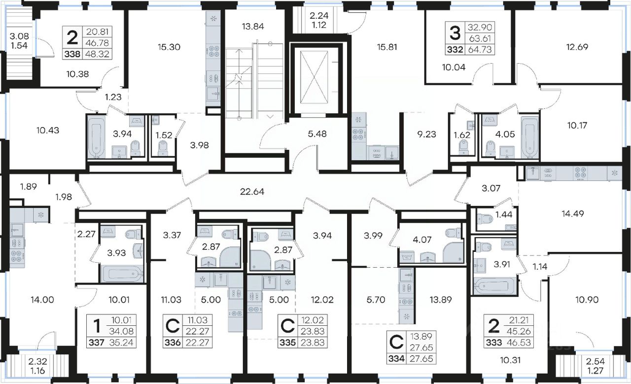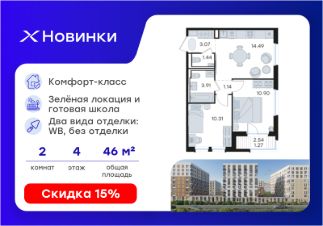 Продается 2-комн. квартира на 4-м этаже в строящемся проекте комфорт-класса Новинки. Общая площадь лота составляет 46,53 кв. м, из которых 21,21 кв. м отведено под жилую и 14,49 кв. м под кухонную зону. Номер квартиры - 333.