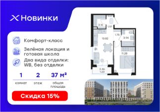 Продается 1-комн. квартира на 2-м этаже в строящемся проекте комфорт-класса Новинки. Общая площадь лота составляет 37,15 кв. м, из которых 11,28 кв. м отведено под жилую и 13,82 кв. м под кухонную зону. Номер квартиры - 391.