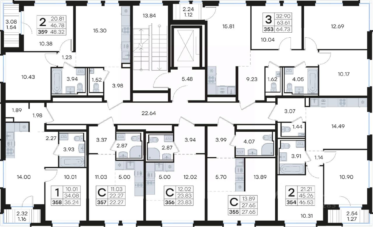 Продается квартира-студия на 7-м этаже в строящемся проекте комфорт-класса Новинки. Общая площадь лота составляет 27,65 кв. м, из которых 13,89 кв. м отведено под жилую и 5,70 кв. м под кухонную зону. Номер квартиры - 355.