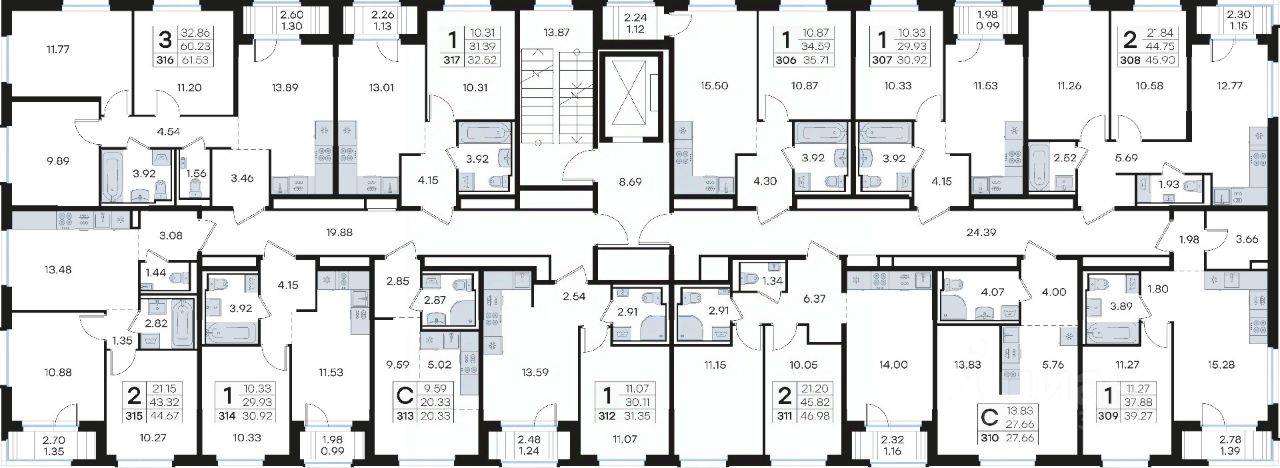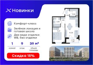 Продается 1-комн. квартира на 9-м этаже в строящемся проекте комфорт-класса Новинки. Общая площадь лота составляет 39,27 кв. м, из которых 11,27 кв. м отведено под жилую и 15,28 кв. м под кухонную зону. Номер квартиры - 309.