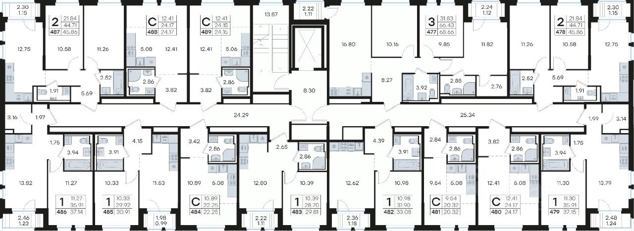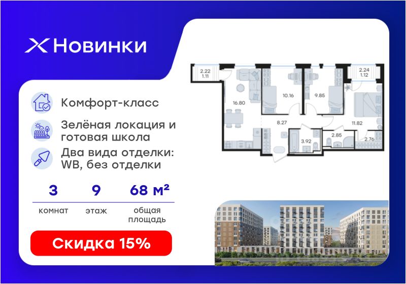 Продается 3-комн. квартира на 9-м этаже в строящемся проекте комфорт-класса Новинки. Общая площадь лота составляет 68,66 кв. м, из которых 31,83 кв. м отведено под жилую и 16,80 кв. м под кухонную зону. Номер квартиры - 477.