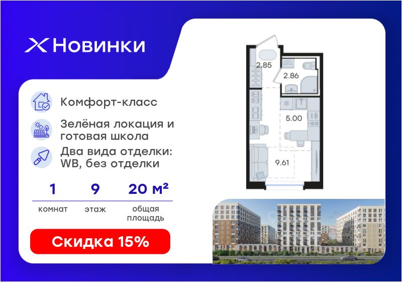 Продается квартира-студия на 9-м этаже в строящемся проекте комфорт-класса Новинки. Общая площадь лота составляет 20,32 кв. м, из которых 9,61 кв. м отведено под жилую и 5,00 кв. м под кухонную зону. Номер квартиры - 593.