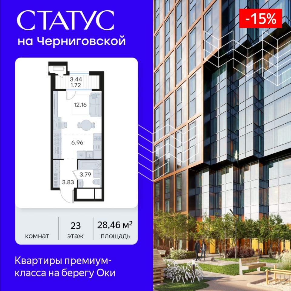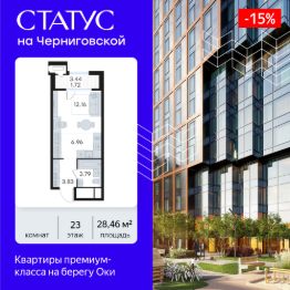 Продается квартира-студия на 23-м этаже в строящемся проекте премиум-класса СТАТУС на Черниговской. Общая площадь лота составляет 28,46 кв. м, из которых 12,16 кв. м отведено под жилую и 6,96 кв. м под кухонную зону. Номер квартиры - 197.