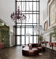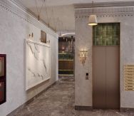 Гранд-лобби с переговорной, кофейней, постоматом, мягкой зоной ожидания. Авторский дизайн холлов с отделкой мрамором, камнем, деревом, керамикой. Роскошная люстра в экстерьере — визитная карточка квартала. В МОПах колясочная, гостевой санузел, лапомойки. Бесшумные лифты можно вызвать без использования рук.