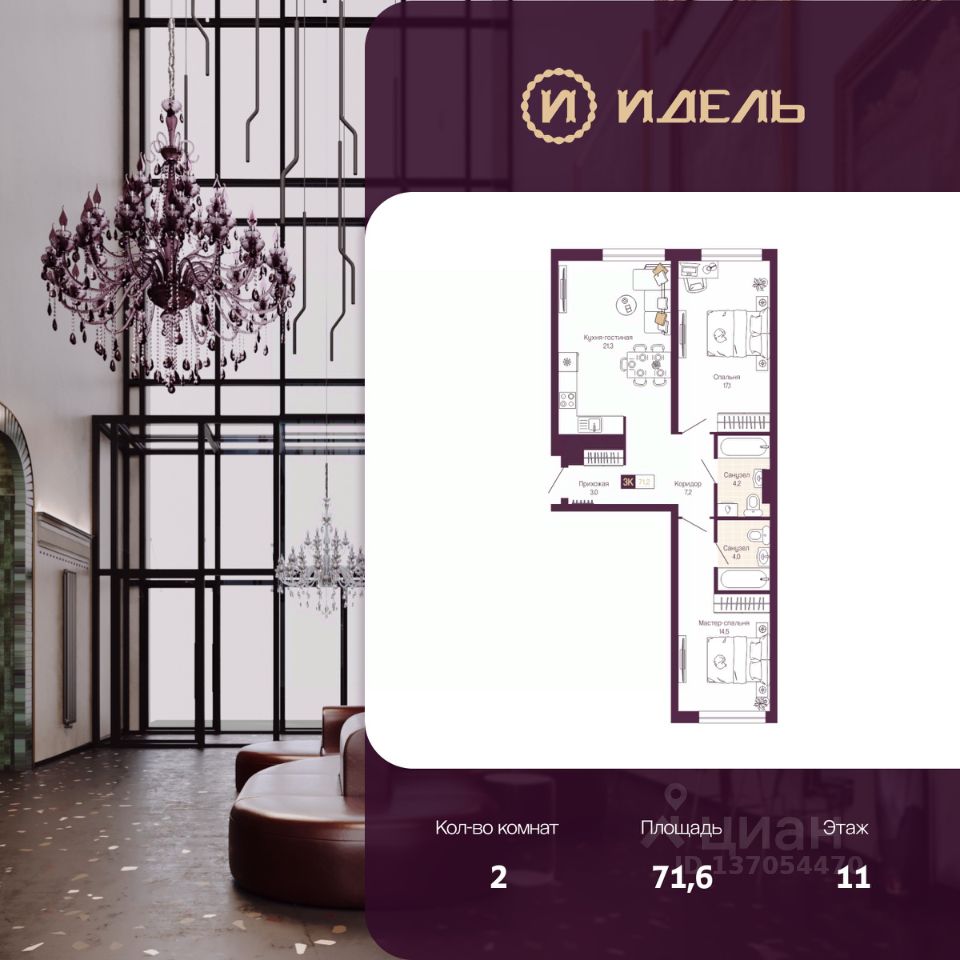 Двухкомнатная квартира от застройщика с предчистовой отделкой в ЖК "Идель. Квартал на Сенной" на 11 этаже. Общая площадь: 71.6 кв.м., жилая: 31.6 кв.м., площадь просторной кухни-столовой: 21.3 кв.м. Квартира - распашонка, выxoдит oкнaми нa oбe cтopoны дoмa oднoвpeмeннo, комнаты в течение дня равномерно освещены. В квартире два совмещенных санузла. Высота потолков 2.8 м.