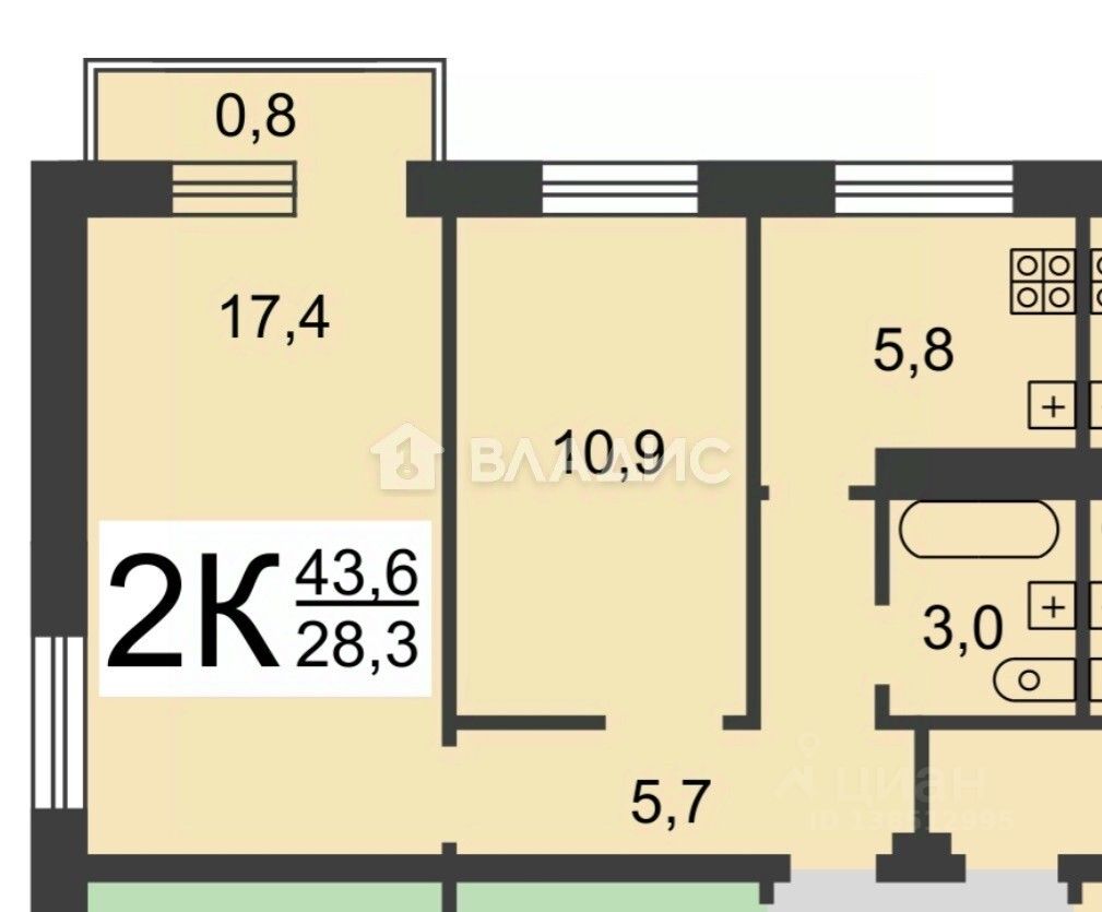 Квартира расположена на третьем этаже пятиэтажного панельного дома 1968 года постройки. Общая площадь составляет 43,5 кв. м, из которых 28,2 кв. м — жилая площадь. Просторная квартира с удобной планировкой — отличное решение для одного человека или молодой семьи.