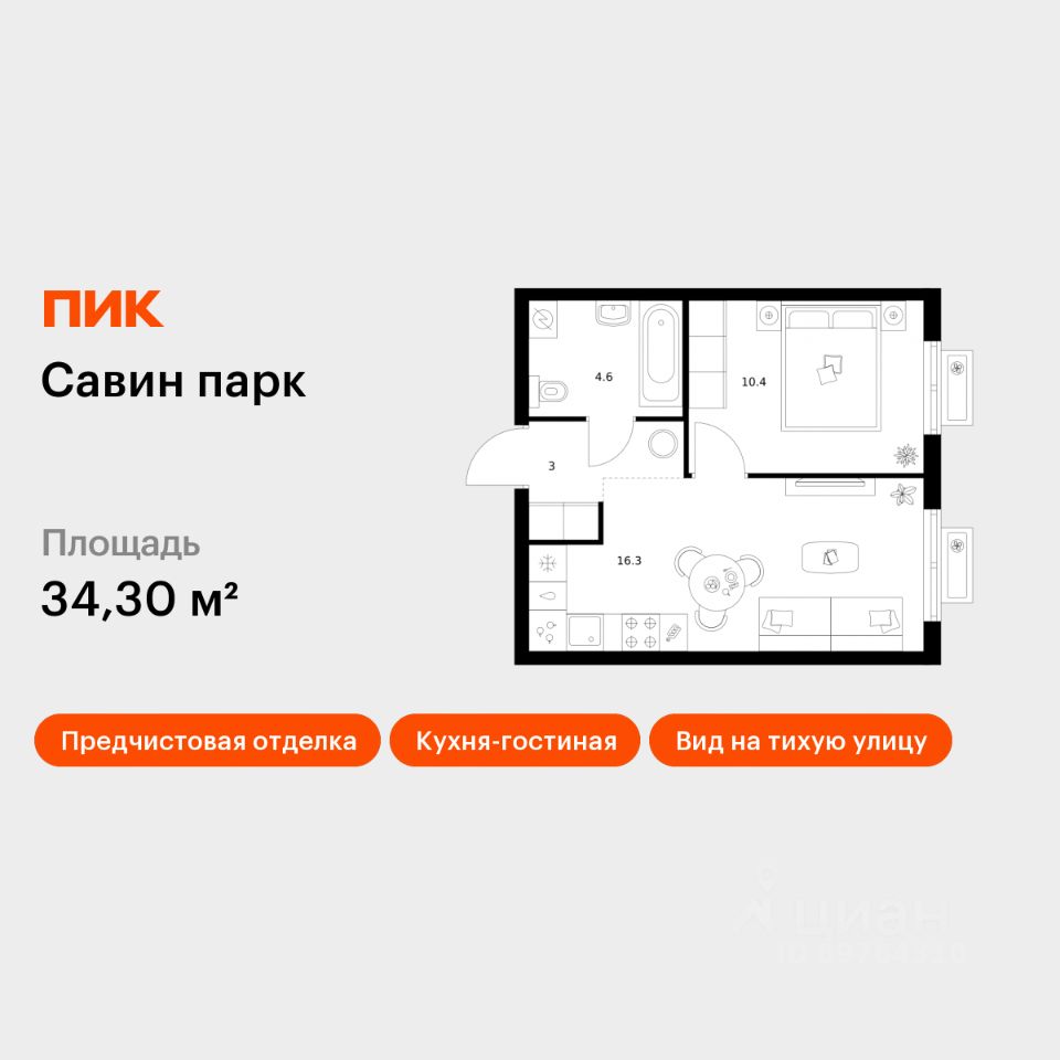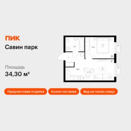 Продаётся 1-комн. квартира площадью 34,3 кв.м на 4 этаже 17 этажного дома (Корпус 9, Секция 1) проекта ПИК Савин парк. Светлый просторный подъезд на уровне земли, функциональная планировка, большие окна, предчистовая отделка.