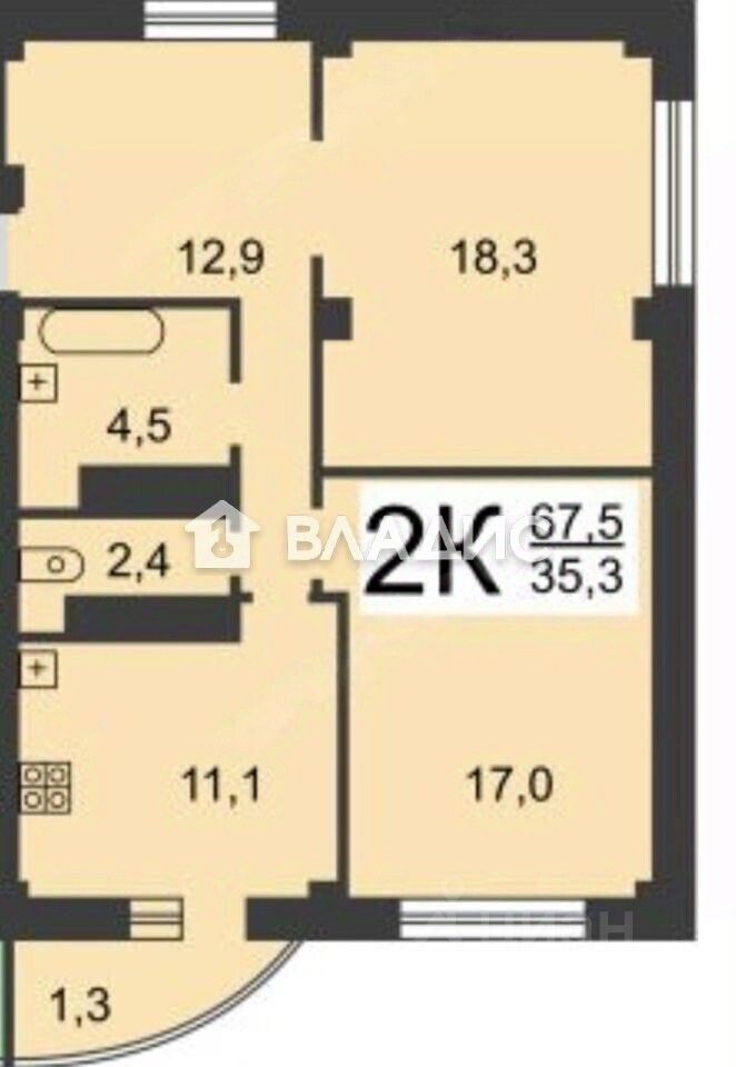 Квартира расположена на десятом этаже семнадцатиэтажного кирпичного дома, построенного в 2009 году. Общая площадь составляет 67,5 кв. м, из которых 35,5 кв. м приходится на жилую площадь. Две изолированные комнаты имеют площадь 18,3 кв. м и 17 кв. м соответственно. Кухня площадью 11,1 кв. м идеально подойдёт для приготовления любимых блюд.
