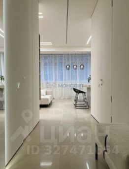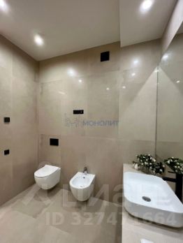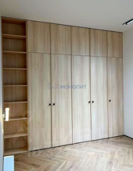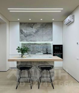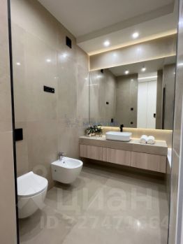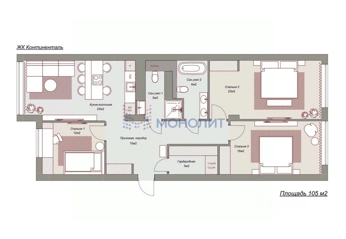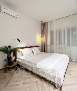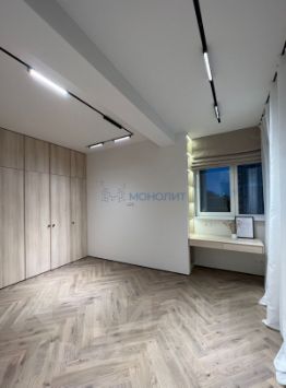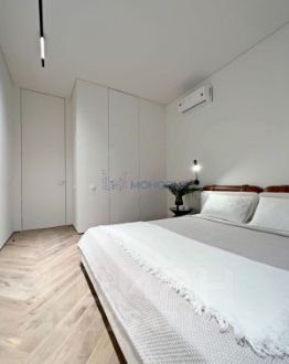 • Общая площадь 105 м². Комфортабельная планировка на две стороны дома с тремя спальнями: детская 12 м², спальня 22 м² и дополнительная спальня/кабинет 18 м²; гостиная объединена с кухней-столовой 22 м², два санузла, общая гардеробная. Выполнено обустройство квартиры мебелью, выполненной на заказ, и полная комплектация техникой.