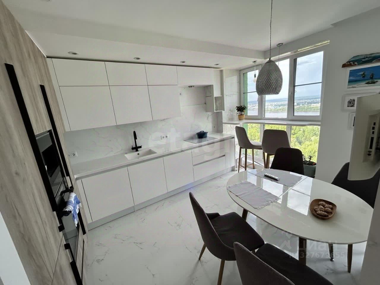Продается трехкомнатная квартира на 21 этаже с панорамным видом на Волгу. Объект предлагается в безупречном состоянии с авторским дизайнерским ремонтом, где использованы натуральные материалы: итальянская паркетная доска, плитка Porcelanosa, каменные столешницы и деревянные элементы. Планировка функциональна и включает светлую спальню, детскую, кабинет с видом на реку и несколько гардеробных зон. Все окна выходят либо на водную гладь, либо в тихий озелененный двор, что гарантирует абсолютную тишину и приватность.