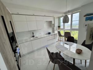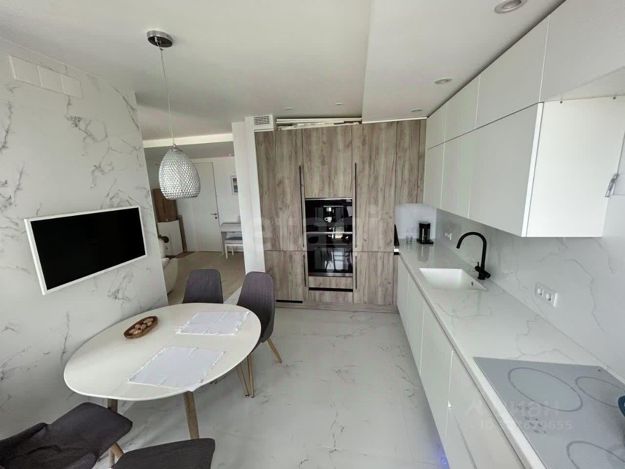 Кухня выполнена по индивидуальному проекту с каменными фасадами, интегрированной техникой премиум-класса (Franke, Kuppersberg) и барной стойкой у окна. Инженерное оснащение соответствует современным стандартам: реализована система "Умный дом" с климат-контролем, электрическими шторами и продуманной акустической разводкой. Вся встроенная мебель (Mr.Doors) и системы хранения остаются новому владельцу.