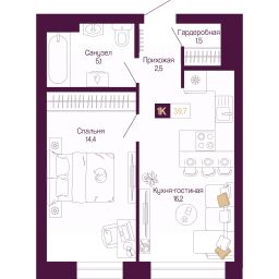 1-комн. квартира от застройщика с предчистовой отделкой в ЖК "Идель. Квартал на Сенной" на 2 этаже. Общая площадь: 39.7 кв.м., жилая: 14.4 кв.м., площадь просторной кухни-столовой: 16.2 кв.м. Все окна выходят на одну сторону. В квартире один совмещенный санузел. Высота потолков 2.8 м.
