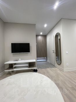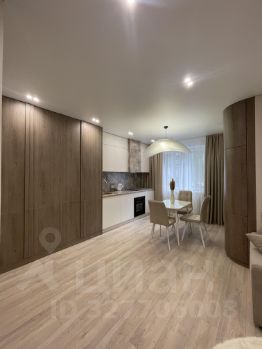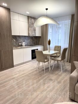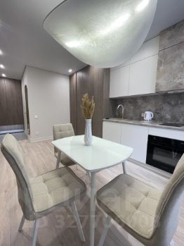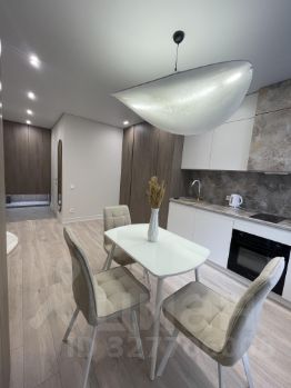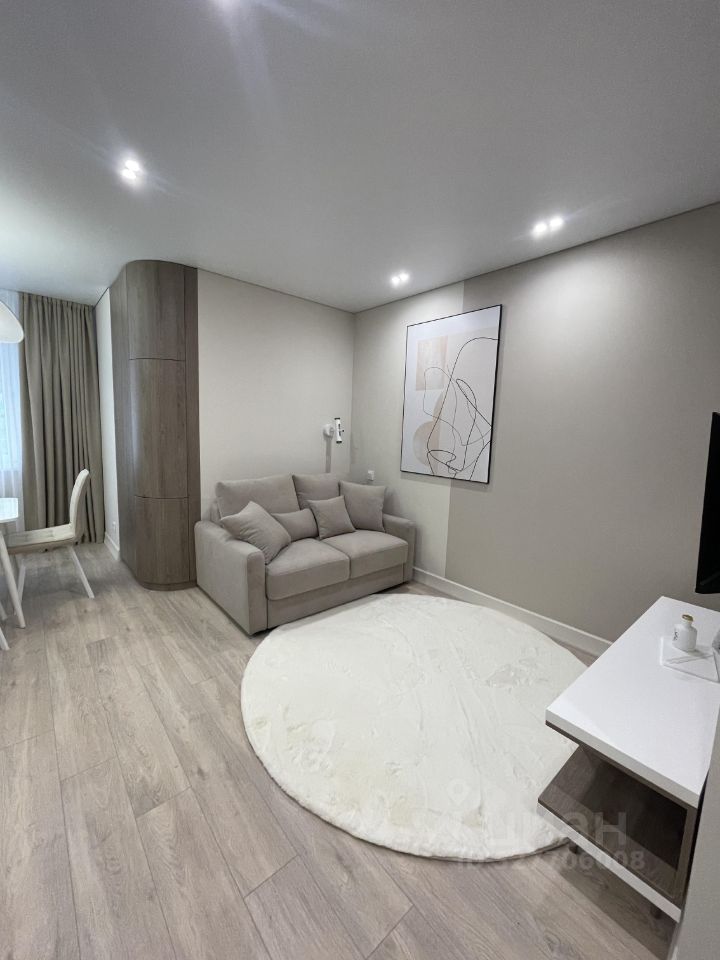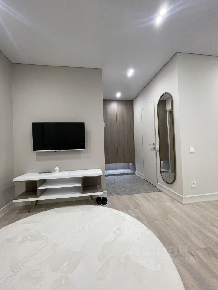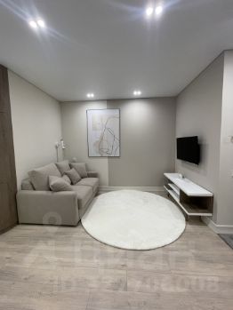 Стильный диван, обеденный стол с современными стульями, системы хранения, ЖК TV;