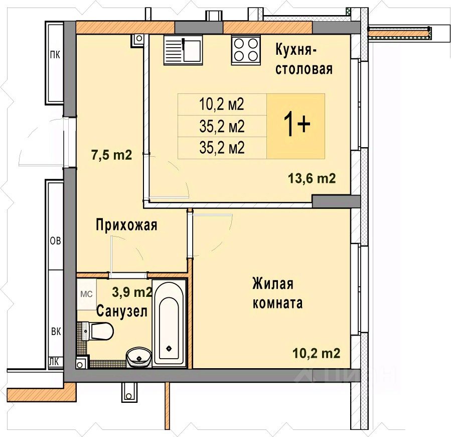 Продается однокомнатная квартира с отделкой в ЖК "Кузнечиха город" на 1 этаже. Общая площадь: 35.2 кв.м. Высота потолков 2.7 м.