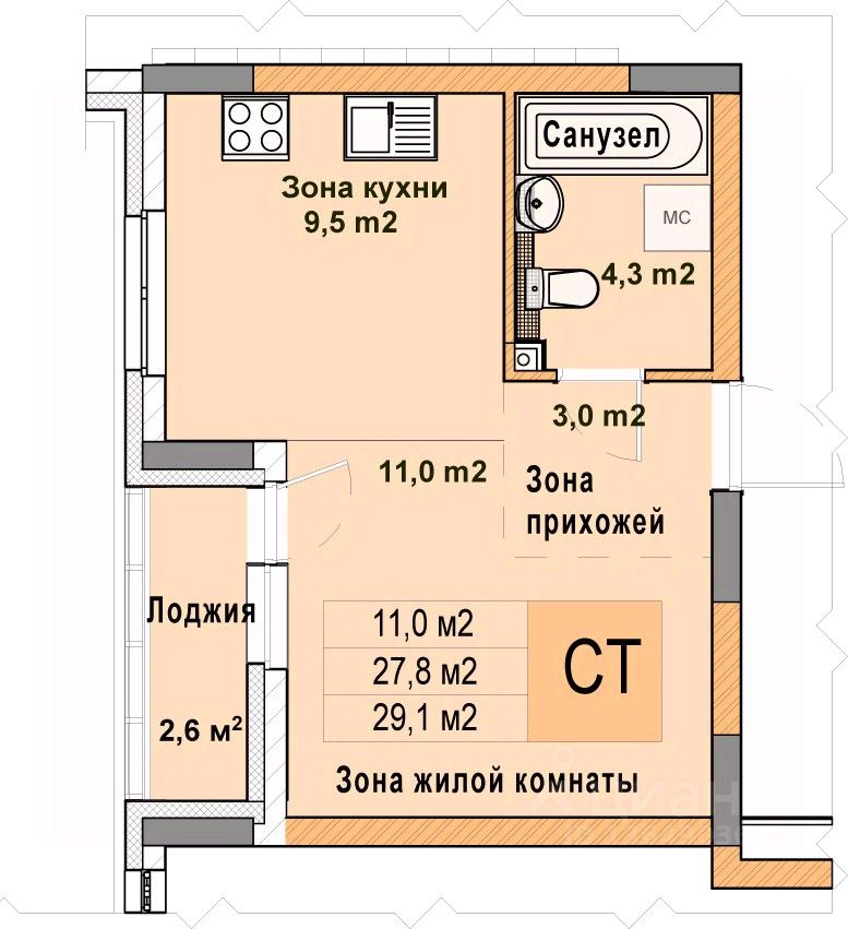 Продается однокомнатная квартира-студия от застройщика с отделкой в ЖК "Кузнечиха город" на 1 этаже. Общая площадь: 29.1 кв.м. Высота потолков 2.7 м.