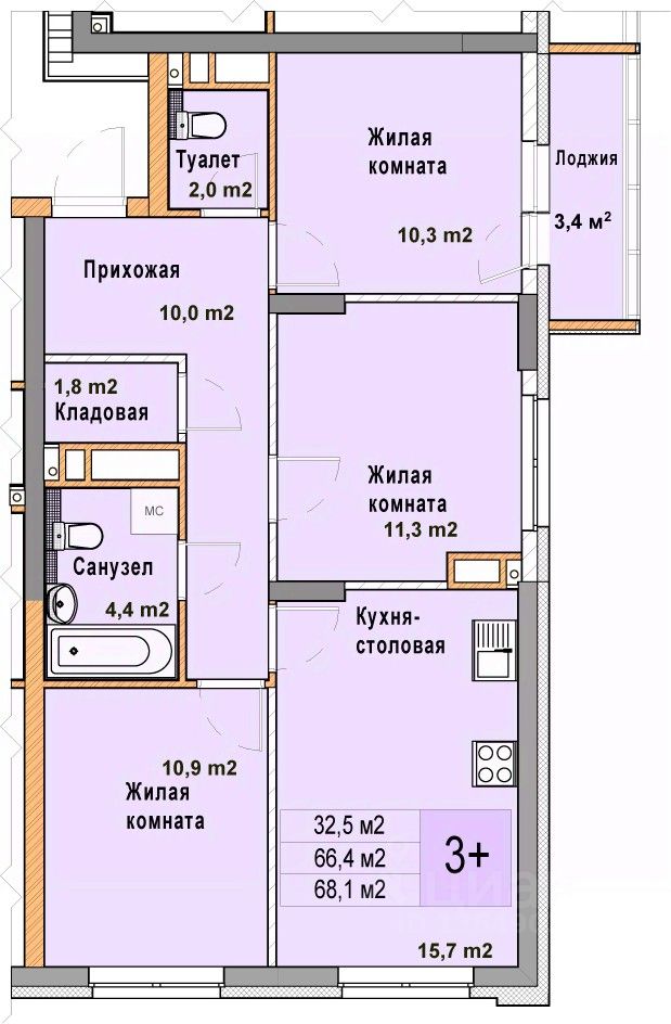 Трехкомнатная квартира от застройщика с отделкой в ЖК "Кузнечиха город" на 6 этаже. Общая площадь: 68.1 кв.м. Высота потолков 2.7 м.