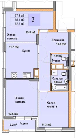 Трехкомнатная квартира с отделкой в ЖК "Кузнечиха город" на 9 этаже. Общая площадь: 67.7 кв.м. Высота потолков 2.7 м.