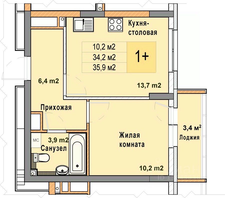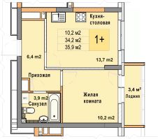 Однокомнатная квартира от застройщика с отделкой в ЖК "Кузнечиха город" на 12 этаже. Общая площадь: 35.9 кв.м., жилая: 10.2 кв.м., площадь просторной кухни-столовой: 13.7 кв.м. Все окна выходят на одну сторону. В квартире один балкон, один совмещенный санузел. Высота потолков 2.7 м.